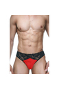 Мужские трусы-танга из черного кружева, с ярко-красной, гладкой вставкой спереди. Состав материала изделия: Производитель: La Blinque. Страна производителя: Турция. Благодаря эротическому белью брен