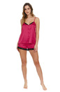 Очаровательная пижама выполнена из сатинового полотна. Комплект состоит из майки на тонких регулируемых бретелях и шортиков. Пижама декорирована кружевом. Идеальный вариант не только для сна, но и для