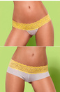Пара белых с желтым кружевом трусиков. В комплект входят шортики и стринги. Рекомендуется ручная стирка. Материал: 94% полиамид, 6% эластан. Упаковка: Картонная коробка.