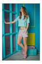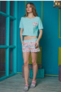 Короткий бирюзовый топ и цветные шорты. Комплект домашней одежды из хлопковой ткани. Однотонный короткий топик нежного бирюзового цвета с короткими рукавами и разноцветным кармашком на груди. Короткие шортики с разноцветным принтом, с поясом на удобной резинке и боковыми кармашками. Состав: Хлопок 95%, Эластан 5%.