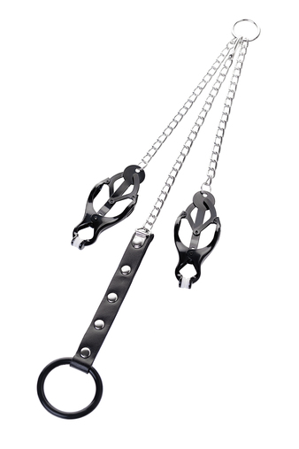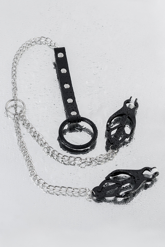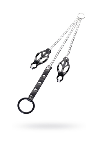 Мужская версия зажимов для воздействия на соски. Соски - одна из основных эрогенных зон женщины и у многих мужчин. Ее стимуляция позволяет добиться множества приятных эффектов и переживаний. Конструкция с пружинным механизмов - один из самых жестких вариантов и может быть усилена или ослаблена во время интимной игры. Зажимы очень легко крепятся на соски при помощи механизма по типу прищепок. Дополнительное ограничение свободы обеспечивает мягкое кольцо на пенис на съемной цепочке. Наконечники защищены силиконовыми накладками во избежание травмирования кожи. Аксессуары подходят также и для мошонки. Длина зажимов 9 см, внутренний диаметр кольца 3,5 см. Общая длина изделия 62 см. Длина сцепки 48,5 см. Вес 70 гр.