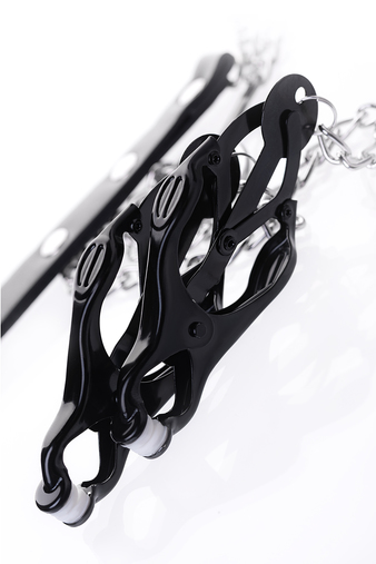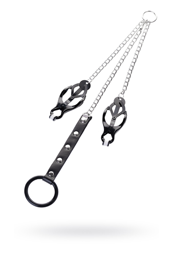 Мужская версия зажимов для воздействия на соски. Соски - одна из основных эрогенных зон женщины и у многих мужчин. Ее стимуляция позволяет добиться множества приятных эффектов и переживаний. Конструкция с пружинным механизмов - один из самых жестких вариантов и может быть усилена или ослаблена во время интимной игры. Зажимы очень легко крепятся на соски при помощи механизма по типу прищепок. Дополнительное ограничение свободы обеспечивает мягкое кольцо на пенис на съемной цепочке. Наконечники защищены силиконовыми накладками во избежание травмирования кожи. Аксессуары подходят также и для мошонки. Длина зажимов 9 см, внутренний диаметр кольца 3,5 см. Общая длина изделия 62 см. Длина сцепки 48,5 см. Вес 70 гр.