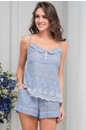 Комплект Mia-Amore состоит из топа на тонких бретелях и шорт, выполнен из натурального хлопка в голубую полоску. Отрезной лиф топа с планкой на пуговицах. Линия декольте украшена декоративным отложным