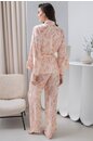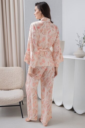 Комплект 3-ка Mia-Amore состоит из запашного жакета с длинным широким рукавом,топа на широких кружевных бретелях и широких брюк с карманами в боковом шве. Комплект выполнен из принтованного смесового