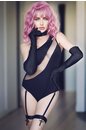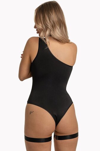 Чувственное боди на одно плечо Jenny. Боди соблазнительно подчеркивает изгибы женского тела и талию. Благодаря тюлевой сетчатой вставке от плеча до бедра удлиняет и стройнит ноги. Необычные подвязки добавляют оригинальности. Спинка непрозрачная. В комплект входят съемные подвязки и боди. Чокера в комплекте нет.
